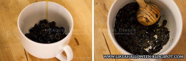 Amasse as azeitonas o melhor possível  para que ela se tornem uma pasta preta - um patê.